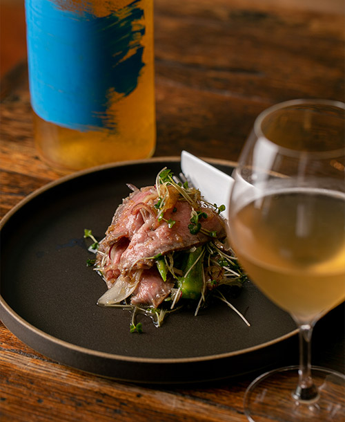 お肉の脂身と赤身の濃厚でバランスの取れた美味しさが、渋くきりっとしたワインの味わいと絶妙に調和します。オレンジワインならではの余韻、広がる爽やかな旨味をお楽しみください。