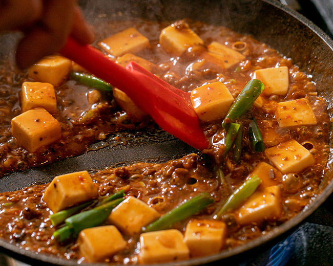 シビれる辛さの麻婆豆腐は、まろやかさを加えることで食べやすい仕上がりに。