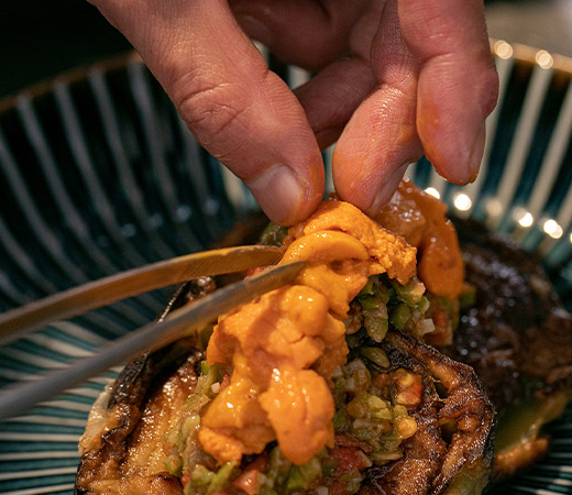 肉質の締まった旬の賀茂茄子は、ムニエルでご提供。