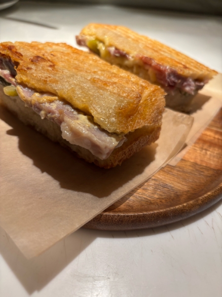 キューバサンド 2025-06-04 18:22:09 こんにちは!最近季節の変わり目で体が追いつかないhonokaです💦本日もご来店頂きありがとうございます!本日ご紹介させていただきますのは、キューバサンドです!!キューバ発祥のホットサンドで、生ハムとロースハム、ピクルスにマスタードをサンドしてプレスしながら焼いています!表面はカリッカリで食べ応えもバツグンです!テイクアウトも出来ますので、明日の朝ごはん用にいかがですか??是非ご賞味ください🤗